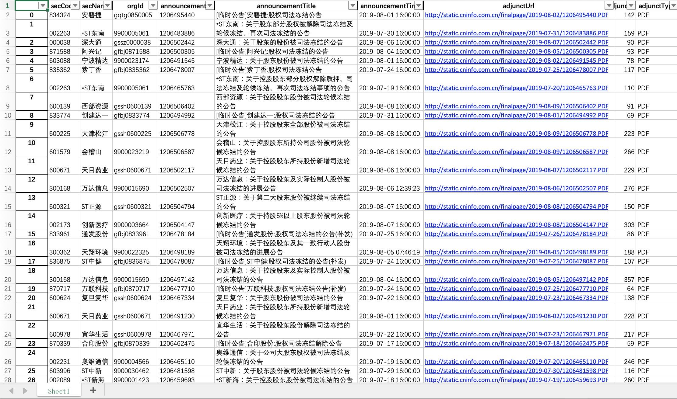 进到巨潮网搜了一下,司法冻结相关的记录有3800多条;一开始担心HTML页面元素复杂,要翻380页,数据量有点大,用requests库实现的爬虫可能吃不消,在考虑是不是要用Scrapy框架。犹豫之中,用Chrome的开发者模式突然间发现巨潮网提供了非常友好的API接口,试着写了一个requests爬虫,一顿猛如虎的操作之后,所有目标数据就都搞到手了。