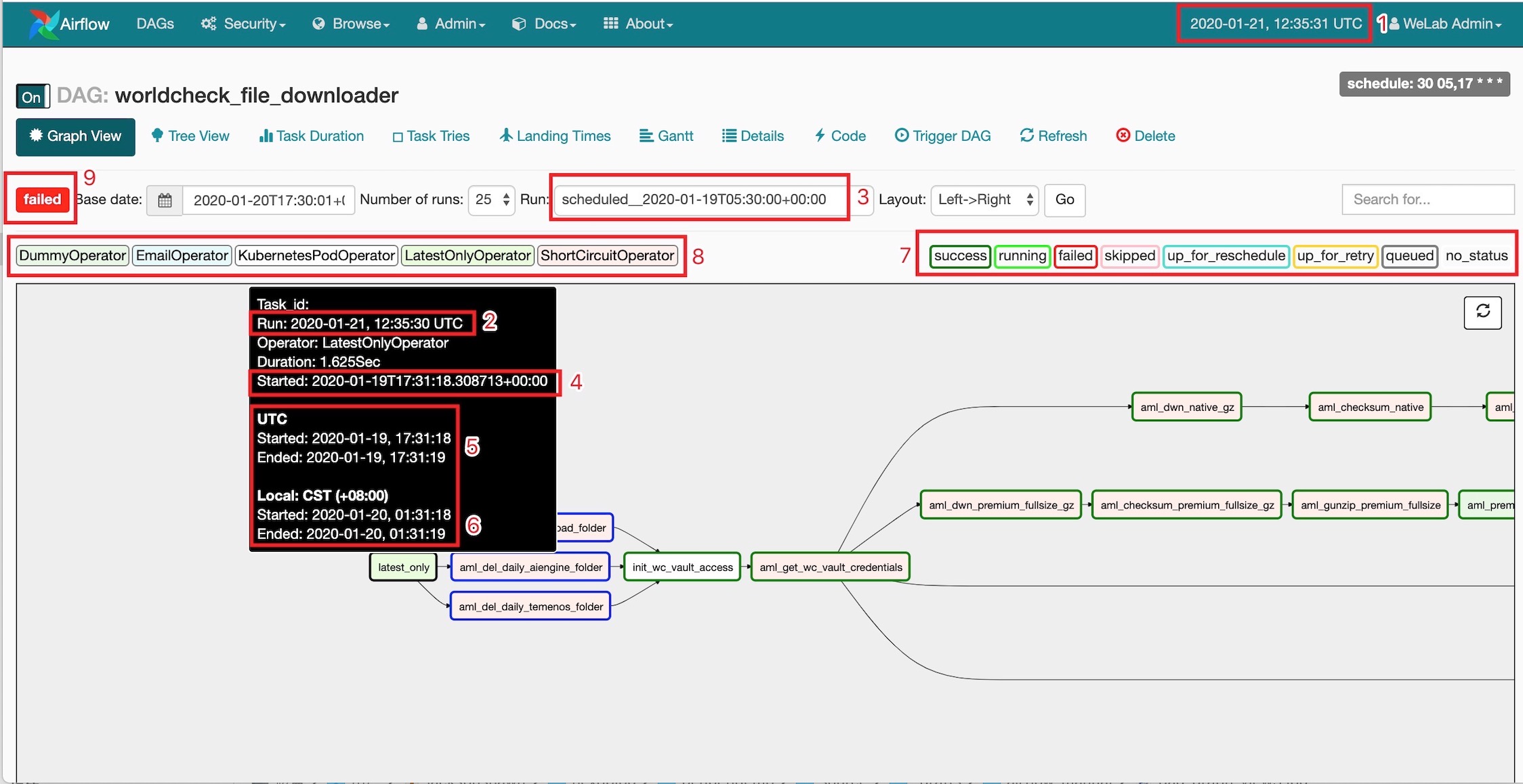 - 数字9:显示DAG当前批次的执行状态,DAG每个批次执行完后,只要有一个task执行状态为