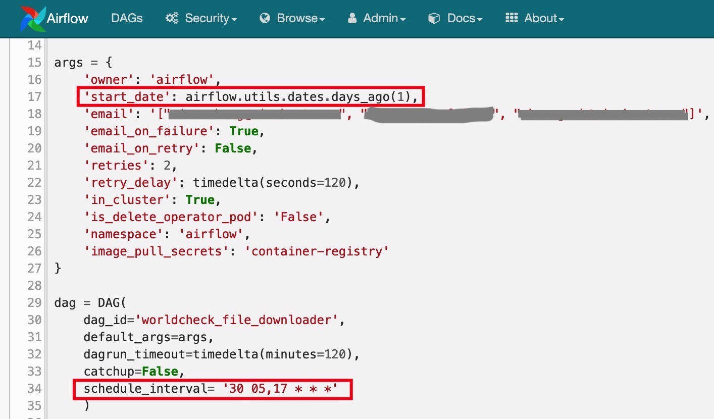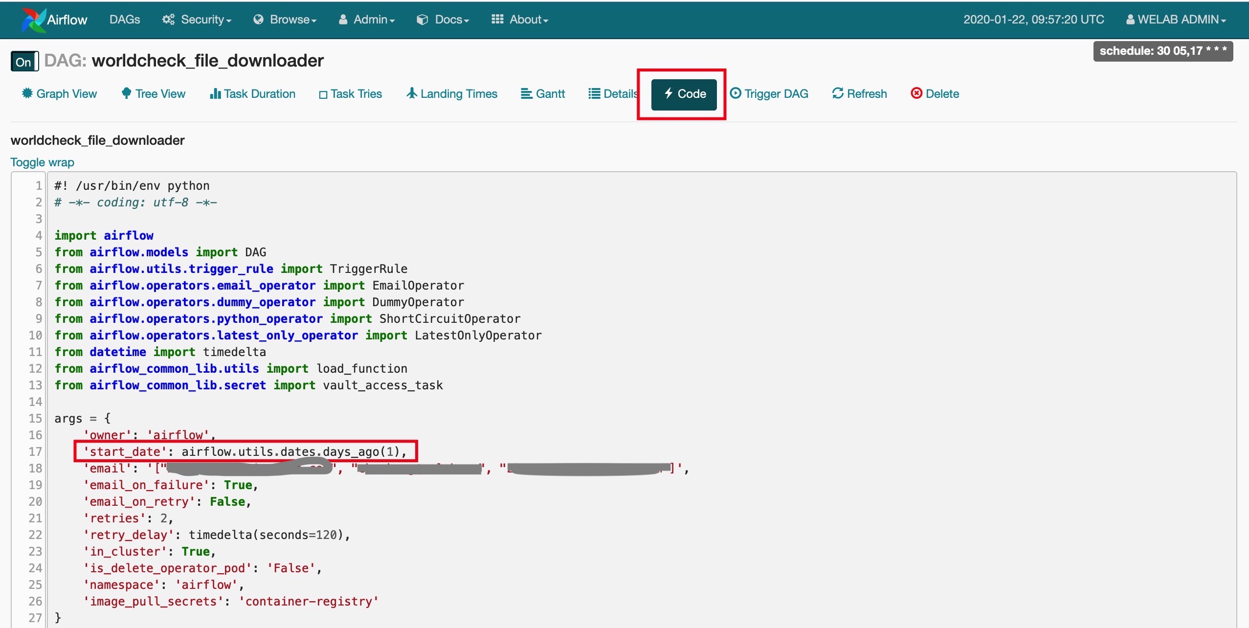 进到DAG执行页面,点击”Code”,查看start_date参数,airflow.utils.dates.days_ago(1)表示是当前日期前一天的零时零分零秒。schedule_interval参数表示DAG被触发的时间间隔,’30 05,17 *’表示每天的05:30和17:30,该DAG会被自动触发,它与Linux cron表达式的格式兼容。