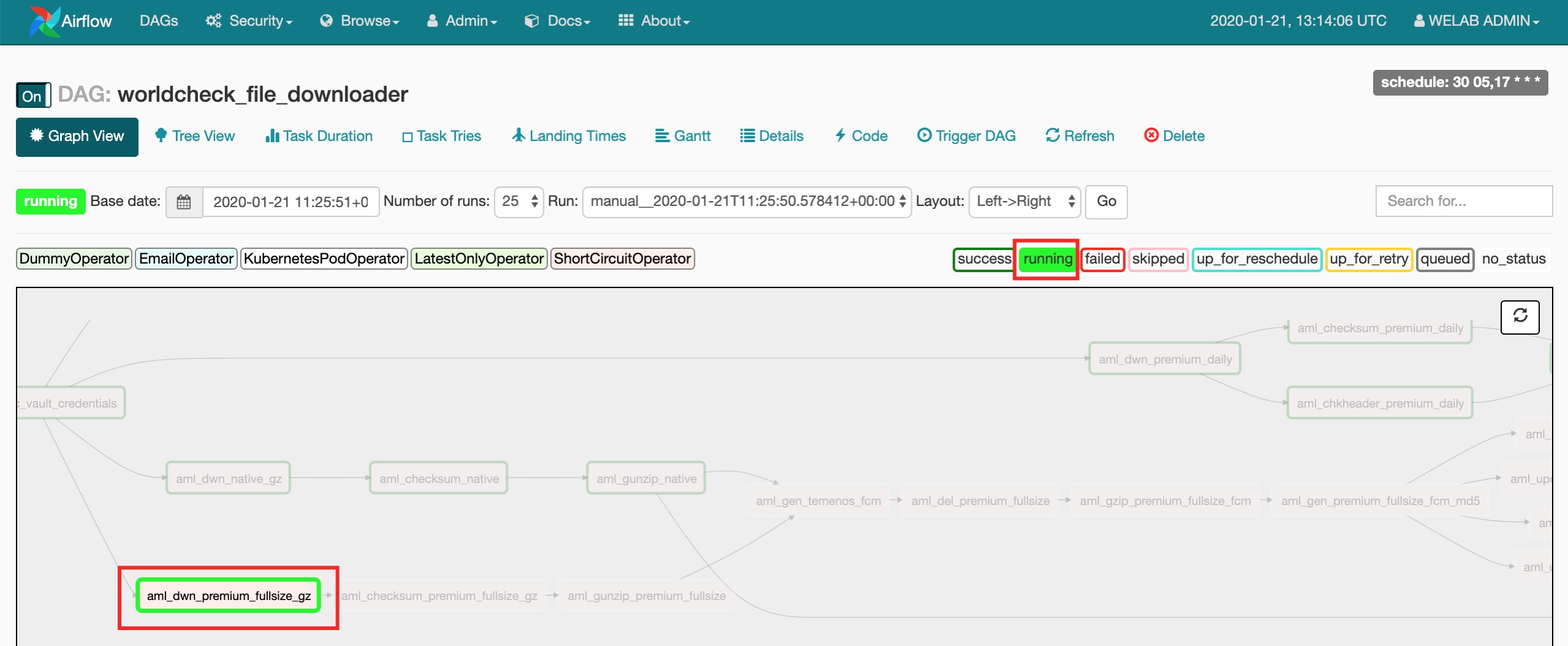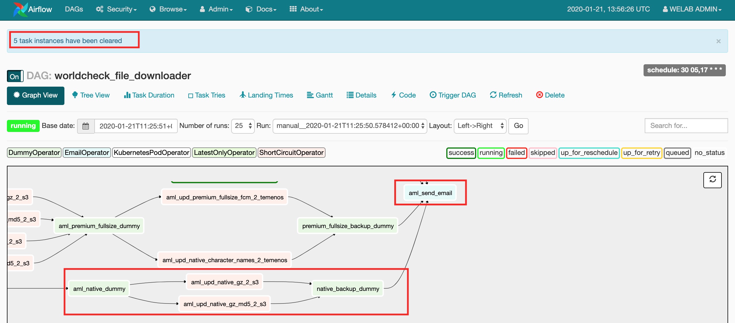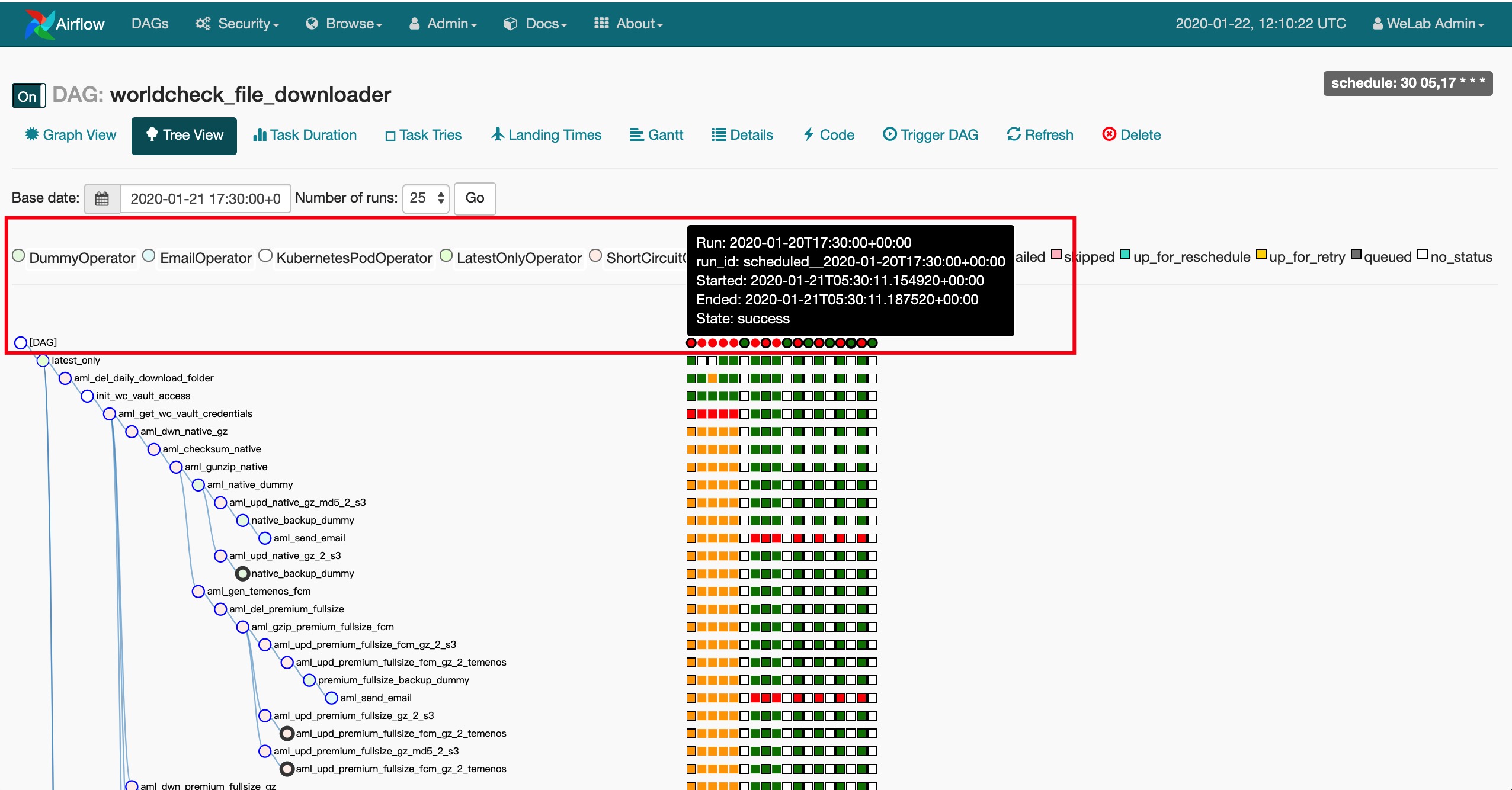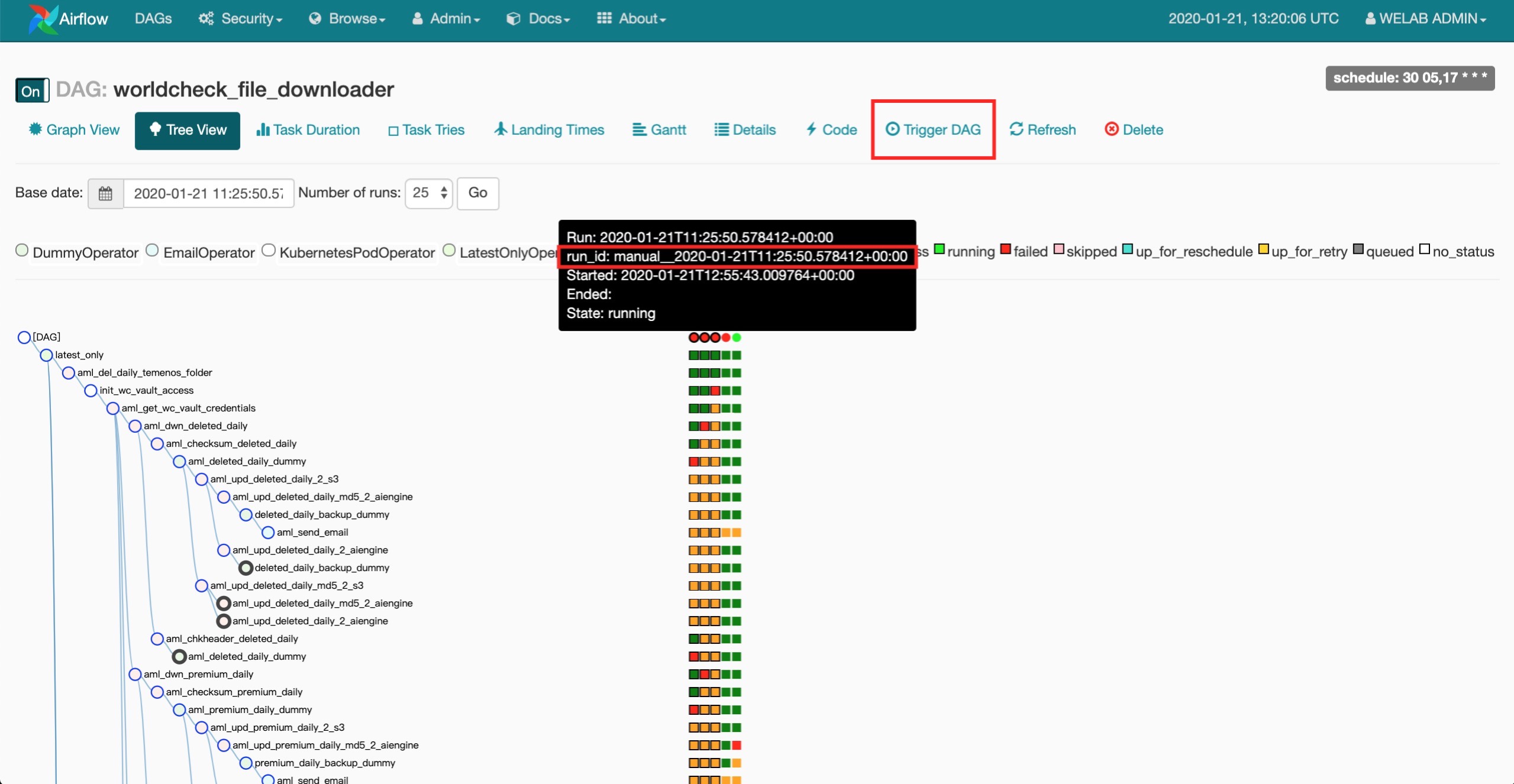 DAG是一个有向无环图,它是一个单向流动的ETL流程图,从上图7中可以看到每一个task的先后执行顺序以及前后依赖关系。只有前置task执行成功后,后续task才会被Trigger;如果后续task有并行分支,会被同时Trigger执行。如上图7aml_get_wc_vault_credentials执行成功后,后续4个task都会同时执行。