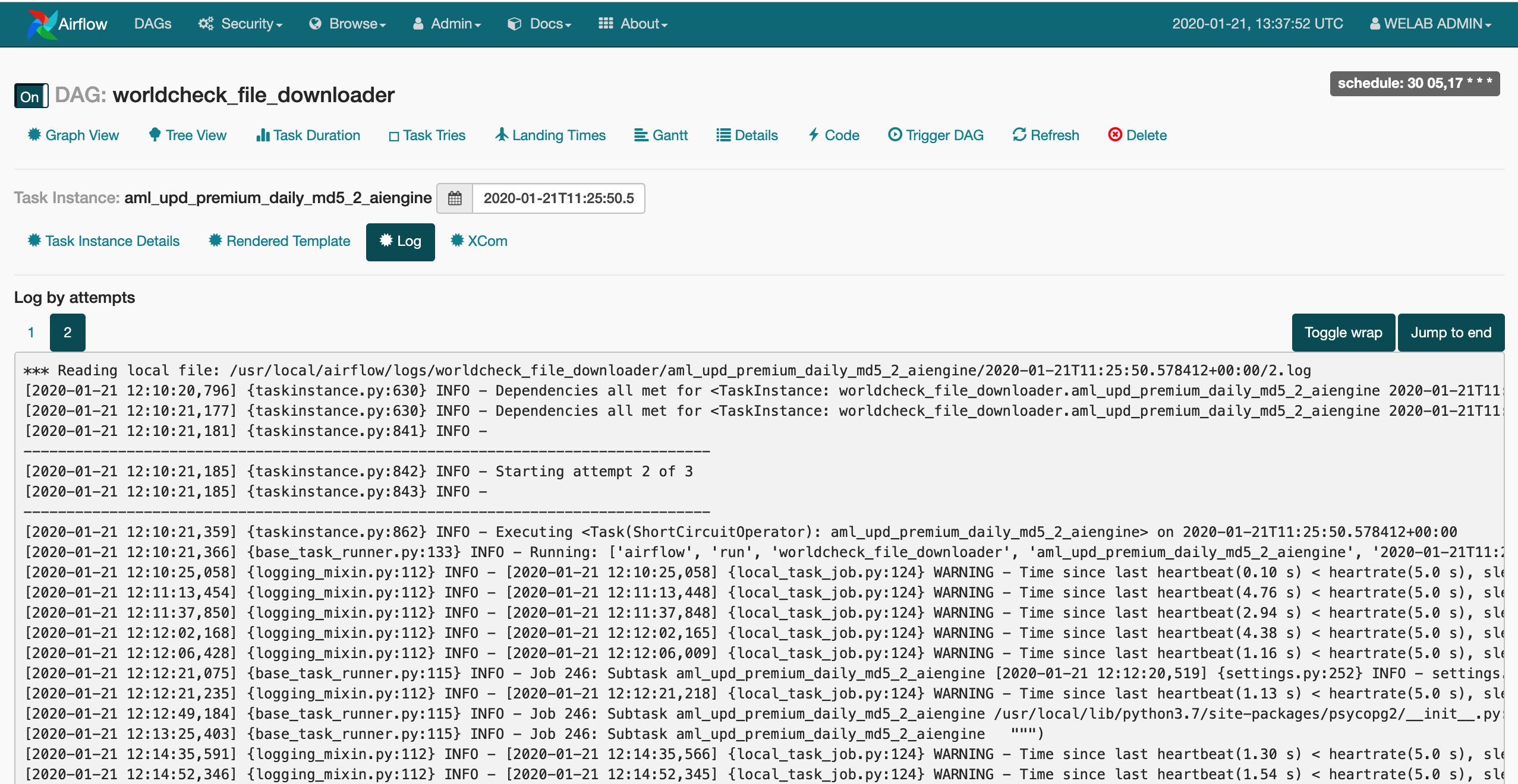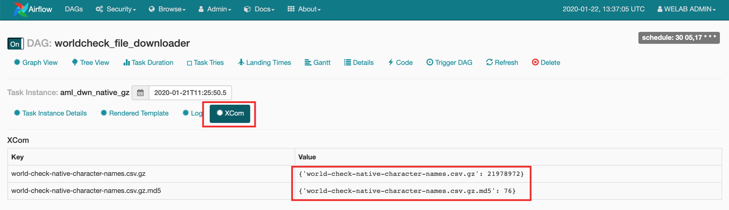 在查看task执行日志旁边,有一个”Xcom”按钮,XCom是Ariflow用于在task之间传递参数的组件。在worldcheck_file_downloader这个DAG中大量使用XCom组件进行参数传递。如下载文件task,备份AWS S3这些task,都有使用XCom功能传递参数,参数传递成功后,参数内容会在XCom页面保留,可以用来辅助查看这些task的执行情况是否符合预期。