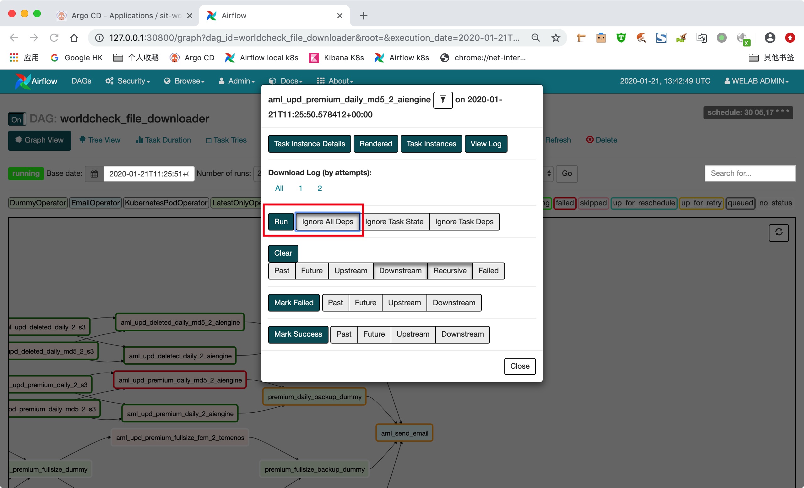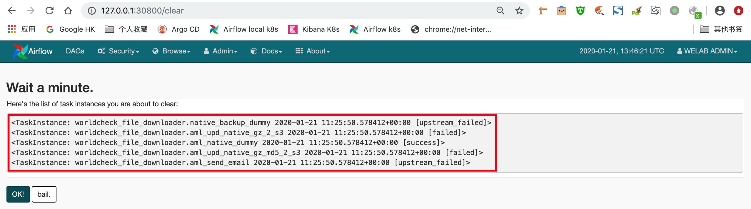 3、点击”OK”后,Airflow会将这些task的最近一次执行记录清除,然后为当前task及所有前置task生成新的instance,将它们放入队列由调度器调度执行
