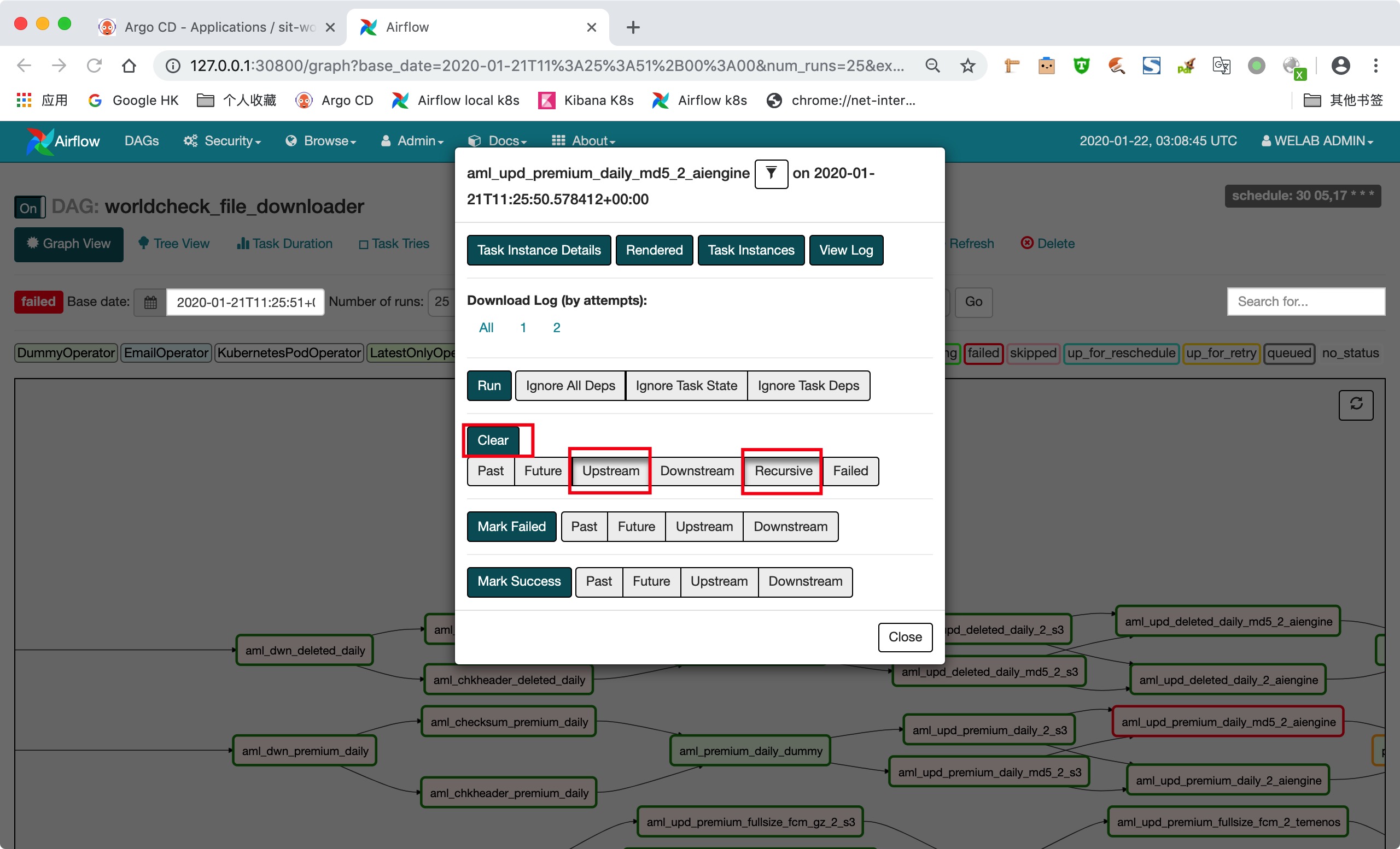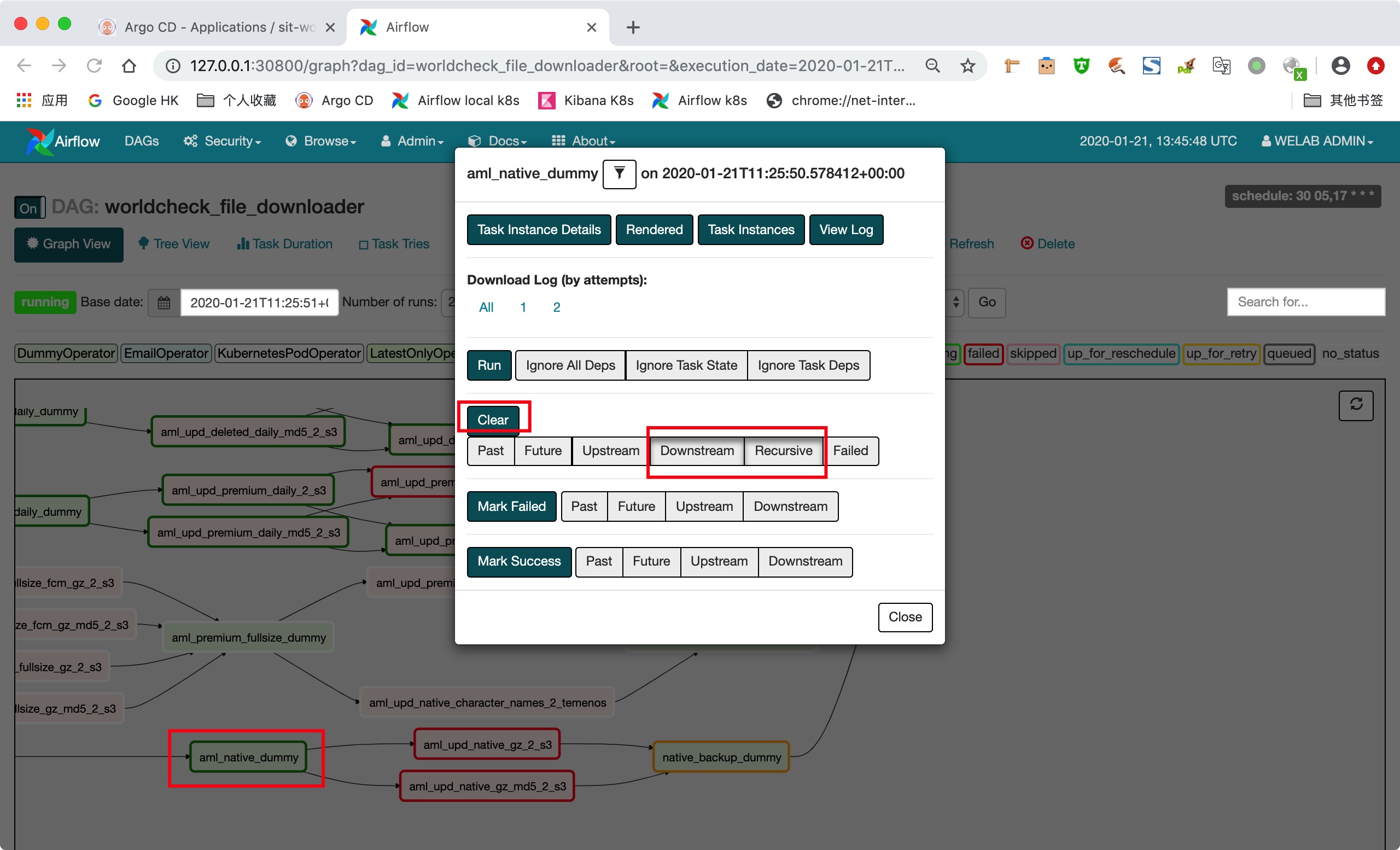 1、点击失败task作业,弹出提示框后,选中”Downstream”和”Recursive”后,点击”Clear”按钮