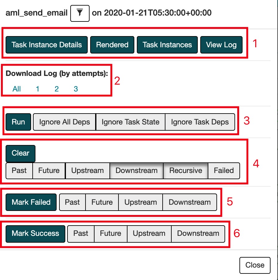 failed,也可以配合”Upstream”参数或”Downstream”参数,将该task所在分支上的所有task的状态标记为failed;数字6和数字5里功能类似,只是用来将task执行状态标记为