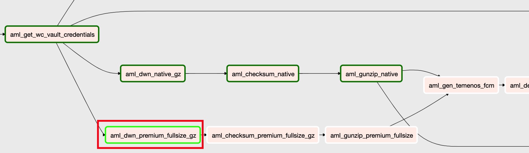 aml_gen_temenos_fcm这个task依赖两个前置task,只有两个前置task执行成功后,才可以rerun当前这个task。 - 由于vault TTL参数被设置为1h,从vault获取sftp账号密码task只能在TTL有效期内被rerun,超过TTL有效期,需要先执行它的前置task,然后才可以rerun