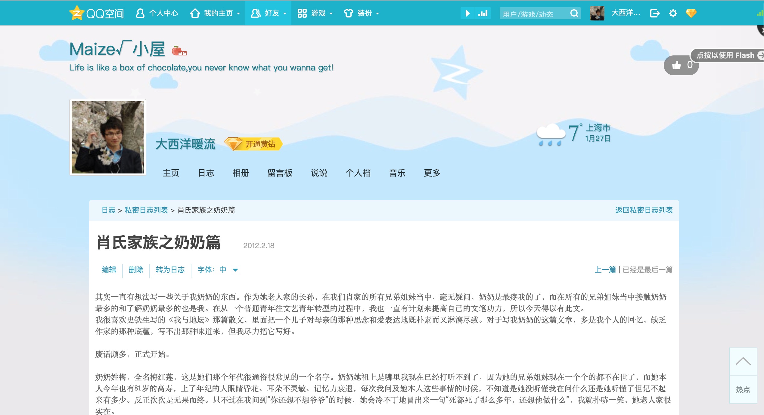 其实一直有想法写一些关于我奶奶的东西。作为她老人家的长孙,在我们肖家的所有兄弟姐妹当中,毫无疑问,奶奶是最疼我的了,而在所有的兄弟姐妹当中接触奶奶最多的和了解奶奶最多的也是我。在从一个普通青年往文艺青年转型的过程中,我也一直有计划来提高自己的文笔功力,所以今天得以有此文。