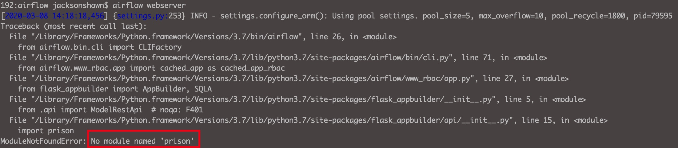 在安装了prison的基础上,使用airflow webserver命令,可以启动airflow的Web UI页面;把prison卸载掉,再使用airflow webserver命令,则提示如下报错,也是flask_appbuilder包提示的报错。