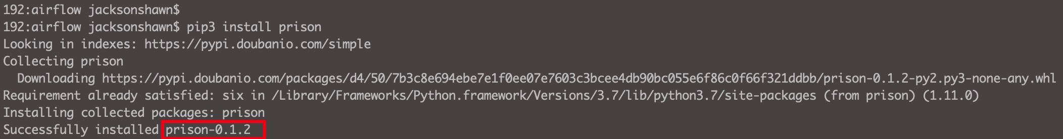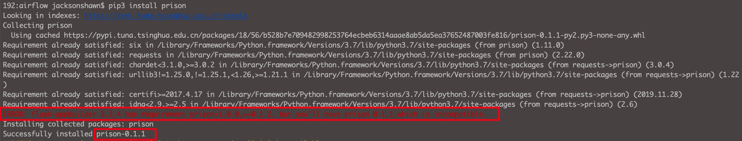 由于我本机默认使用清华的pip源,使用pip3 install prison安装可以看到它安装的是prison-0.1.1版本,并不是最新的prison-0.1.2版本,并且提示了ERROR信息。虽然报错,但prison-0.1.1版本还是安装成功,我试了一下airflow webserver能够启动成功。