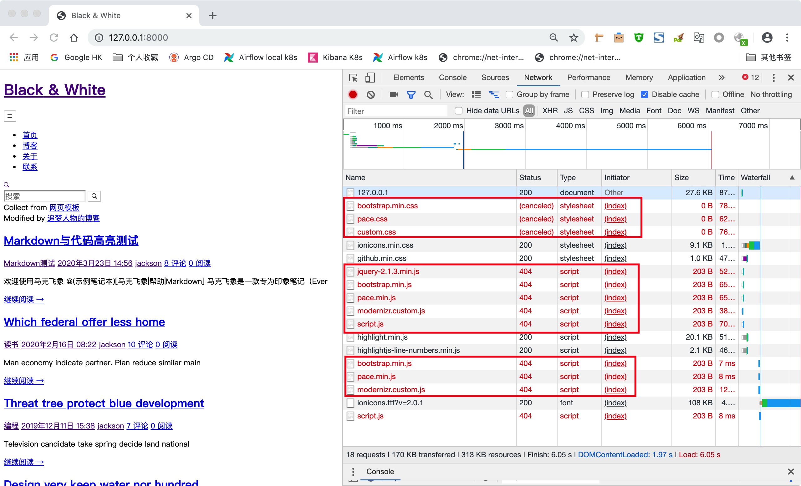 把project目录下settings.py文件中DEBUG设置为False,页面均可以访问,但加载css和js资源提示404。将DEBUG调为True,这些404就没有了。